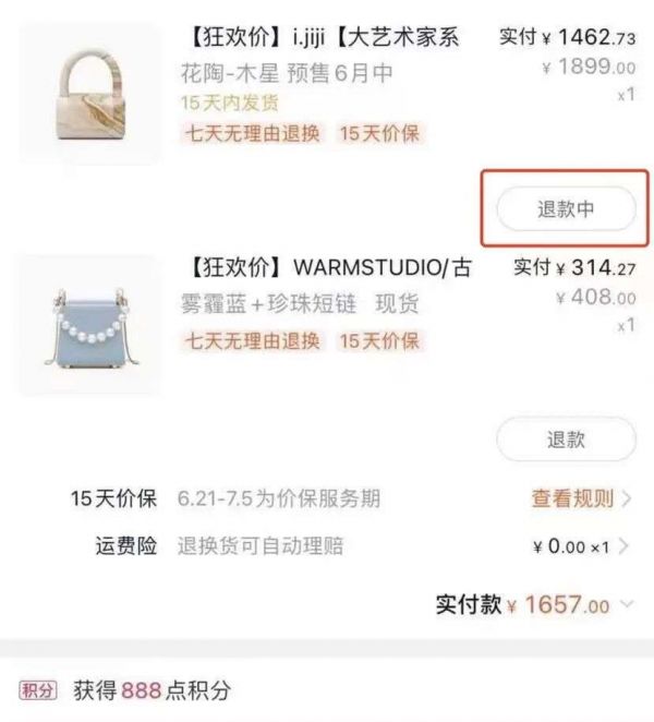 你想买一个包,直接购买需要付400多元,如果再加购一个标价1800多的包,因为凑够了满减,可以用优惠券,那个想要的包包价格骤降到300出头,优惠生成后,再把价值1800多的包申请退款。这通神操作就可以省掉将近100元。