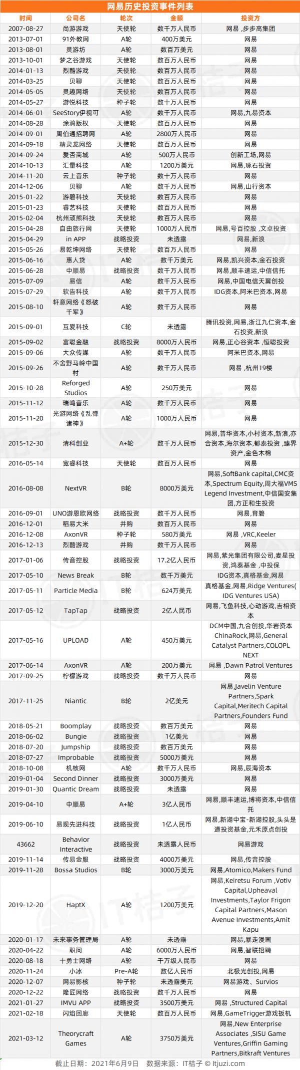 IT 桔子数据显示,近三年以来,网易年均的投资频率正在下降,从 2019 年的 7 起公开事件降至 2021 年截止 6 月 15 日的 3 起投资事件。综合来说,网易发展始终有「专注自家」的味道——凭借网易强大的研发能力,在教育、音乐、游戏等领域中,网易往往更依赖自己的产品输出,投资作为业务的补充展开。目前,这种态度或许正随着网易内部业务的独立而加强——近年来,包括网易有道已独立上市、网易云音乐近期正寻求上市、网易考拉/网易漫画被出售等,网易正在用更专注「精品」的态度示人。