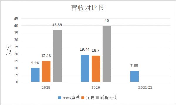 从营收规模上,BOSS直聘2019年,2020年的年报营收数据分别是9.98亿元和19.44亿元。而猎聘的营收数据是15.13亿元和18.7亿元。作为老牌互联网招聘公司,前程无忧的营收数据2019年和2020年分别为36.89亿元和40亿元。创新性招聘平台与老牌的综合招聘平台,营收数据相差甚远。