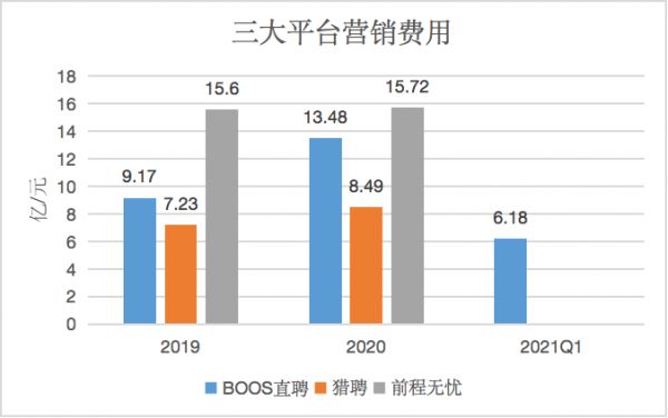 招股书显示,2019年和2020年,BOSS直聘的营销费用分别达到9.17亿元和13.48亿元,营销费用要远高于猎聘,仅次行业龙头前程无忧。