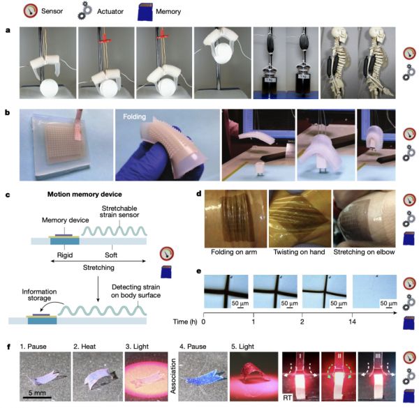 嵌入内存的软物质,这一类功能性软物质结合了物质记忆和感知能力。有科学家在一种机械杂化材料中已验证这一概念,其中电阻开关器件作为刚性聚合光刻胶(SU-8)岛上的存储元件,该岛嵌入可拉伸聚二甲基硅氧烷(PDMS)中,在聚二甲基硅氧烷上蒸发的金薄膜中的微裂纹同时起着电极和应力传感器的作用,这种运动记忆装置允许基于应力的变化和随后的信息存储来检测人类的四肢运动。