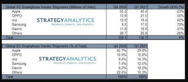 vivo、三星5G手机Q1出货量猛增,蚕食苹果主导地位