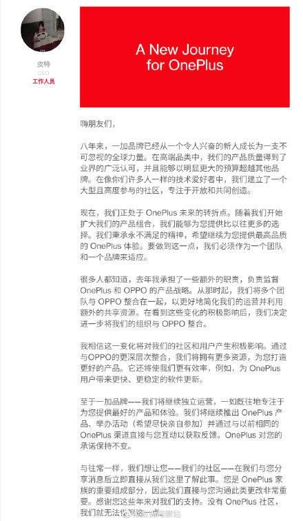6 月 17 日,刘作虎在海外网站官宣了这一消息。在公告中,刘作虎也表示了双方融合之后,一加将继续独立运营。
