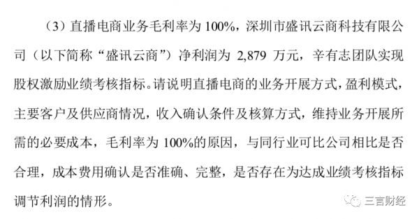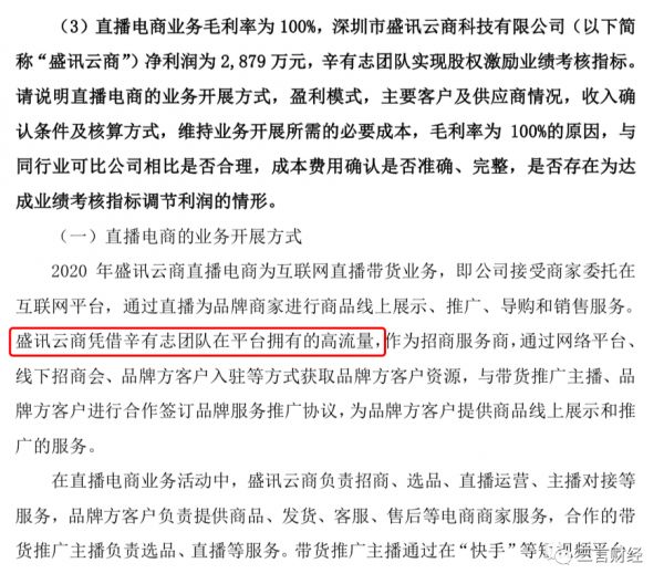 在关于毛利率100%问题的回复中,盛迅达三次强调是直播电商业务的良好表现得益于“辛有志团队在平台拥有的高流量”。