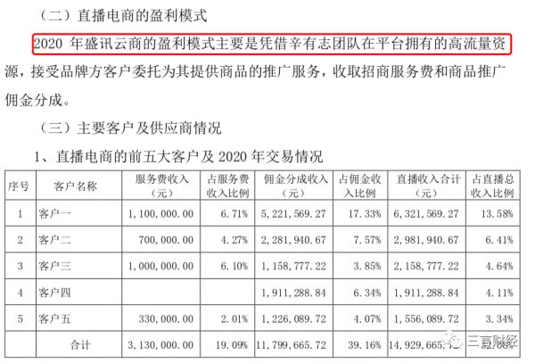 其中盛讯云商直播电商的前五大客户中,第一大客户服务费收入110万,佣金分成收入522万,收入合计632万。