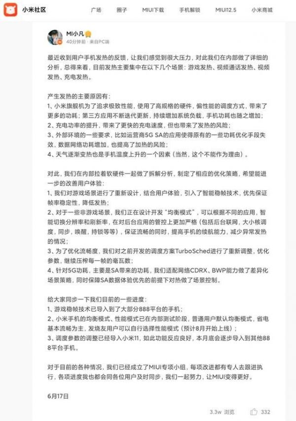@界面新闻【小米回应手机异常发热:均衡模式、性能模式已在内测阶段】6月17日晚,小米产品总监、MIUI体验总负责人@MIUI小凡 在小米社区发文回应用户手机发热反馈,称已制定相应的优化策略,对游戏场景进行了重新设计,引入智能稳帧技术;对于一些非游戏场景,正设计开发“均衡模式”,可以根据不同的应用智能切换分辨率和刷新率,减少异常发热的情况。