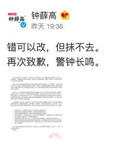 @钟薛高官方微博【钟薛高发致歉信:创业初期的两次行政处罚如同警钟】6月17日晚,钟薛高在其官方微博发布道歉信称:“最近社交平台上因某些原因再次引发了关于钟薛高曾收到上海市行政处罚的讨论,又一次提需我们:过去犯过的错虽然可以改正,却无法抹去。