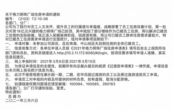 界面新闻从一位格力员工处获悉,今年3月,格力总裁办曾发布关于申请明珠广场住房的通知。邮件显示,该套楼盘3月时已进入前期装修阶段,由于房源有限,主要解决的是已婚,且在珠海、中山无房员工的需求。