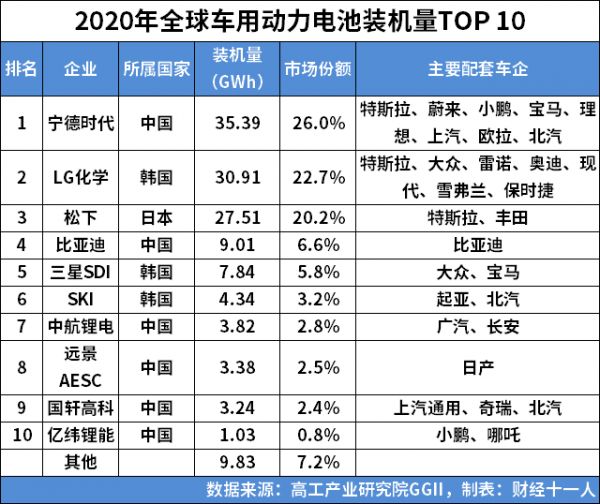 表1 :2020年全球车用动力电池装机量TOP10