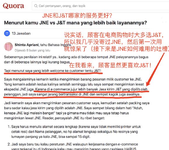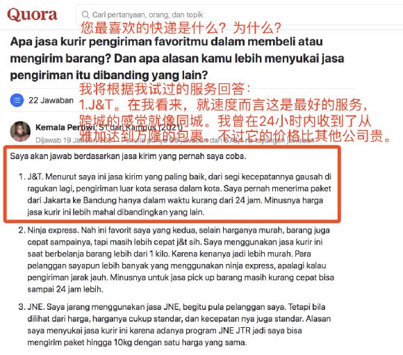 因此,在Quora关于“最喜欢哪家快递”的印尼语提问下,J&T往往能出现在答案前排: