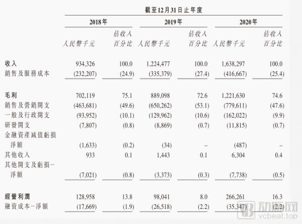 营收数据也是一大亮点。招股书显示,雍禾植发的总收入从2018年的9.34亿人民币增长到2019年的12.2亿人民币,增幅为31.1%,2020年总收入继续攀升,达到了16.4亿人民币,同比增幅为33.8%。而毛利方面,2018年到2020年皆维持在了70%以上的高位上。