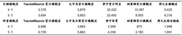 图2:天猫和抖音旗舰店销量数据对比(万元) 数据来源:淘数据,壁虎看看,广发证券,36氪