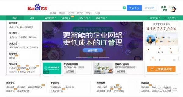 目前的百度文库首页,教育、应用文书、资格考试、专业文献等成为主推内容