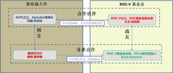 目前 SiFive 的创始人 Krste Asanovic 是 RISC-V 基金会的主席,副主席就是大卫·帕特森。这些大神之间的关系可以用以下的人物图谱表述: