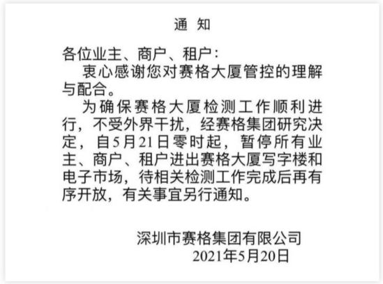 之后两天,赛格大厦又晃动了两次。5月20日,赛格集团发布了一份通知:自21日起,暂停所有业主、商户、租户进出赛格大厦写字楼和电子市场。