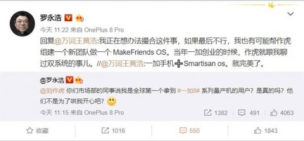 其实,在去年4月份的时候,有用户在微博上表示一加手机+Smartisan OS就完美了,当时罗永浩透露:“我正在想办法撮合这件事,如果最后不行,我也有可能帮作虎组建一个新团队做OS。”刘作虎也表示:“那要不我们玩点不一样的。”