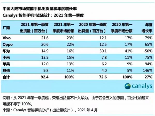 自华为遭遇芯片危机后,国内市场份额被小米和OPPO等企业分食。VIVO和OPPO今年一季度的手机出货量都超过了两千万台,同比增幅都超过了60%,其中VIVO的同比增幅甚至接近80%。