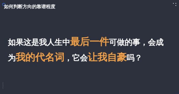 如果说你依然面临着很多选择,那么你可以问自己最后一个问题,如果说我现在做的事情就是我人生中最后一件我能做的事情,并且今后我的后代,我的其他的朋友、同学、亲戚都会给我打一个标签,这个标签会让我感到自豪吗?如果是的话,你一定要立刻做。
