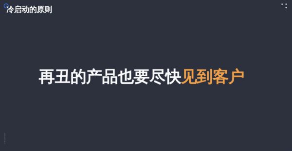 在你做好产品之后的话,你可能要进行一个冷启动,冷启动的定义就是你长期没有客户,长期没有用户,或者收入非常不稳定。在这种情况下,不同的行业,不同的公司可能有一个不同的类型的时间阶段。在冷启动阶段,创始人一定要保持耐心,有恒心、有毅力,而且对你的产品、市场、目标客户也非常自信。