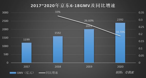 据京东公布的GMV数据显示,2017年至2020年四年来,京东618近年来GMV增速连年下降。