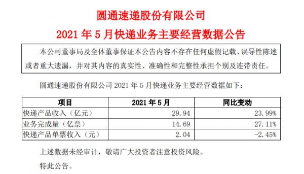 数据显示,韵达、圆通、申通以及顺丰快递今年5月份的业务量不管是环比还是同比,都有不同程度的增长,但是从单票收入来看,仍然低于2020年同期水平。