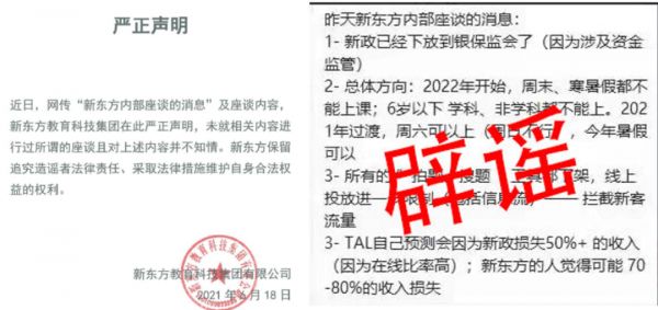 与之相似的是,一则新东方内部座谈的消息也被放出,称2022年开始周末、寒暑假都不能上课;6岁以下学科、非学科都不能上;所有的拍题、搜题工具全下架,线上投放进一步限制;公司自己预测会因为新政损失50%+的收入。6月18日下午,该传言遭新东方辟谣。