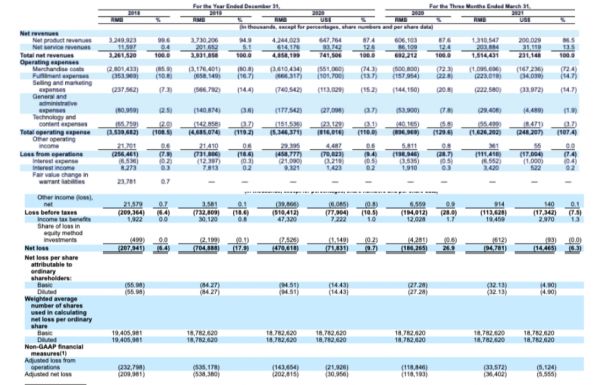 除此之外,爱回收还面临一定的资金压力。招股书显示,截至2020年底,爱回收账面的现金及等价物为1.4亿美元,而到Q1结束已经变为1亿美元,三个月里减少了将近1/3。