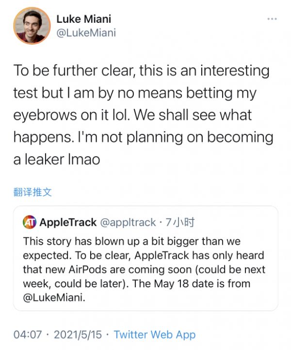 今年5月,数码博主Luke Miani在推特表示,AirPods 3将于5月18日通过新闻稿的方式线上发布。结果还是扑了个空,当时苹果没有发布任何消息,官网也没有上架新品。