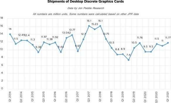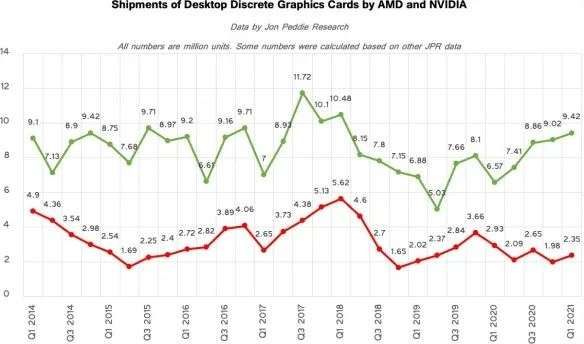所以,当Jon Peddie Research公布了调查结果后,玩家们就不淡定了,根据调查报告显示,今年Q1季度的显卡芯片量高达1.9亿颗。其中除了AMD的产能主要供应PS5和Xbox的需求外,英伟达的产能基本上都放到了普通显卡和矿卡上,甚至为此重启了多条生产线,已经停产的2060等芯片都开始重新出现在供应链上。