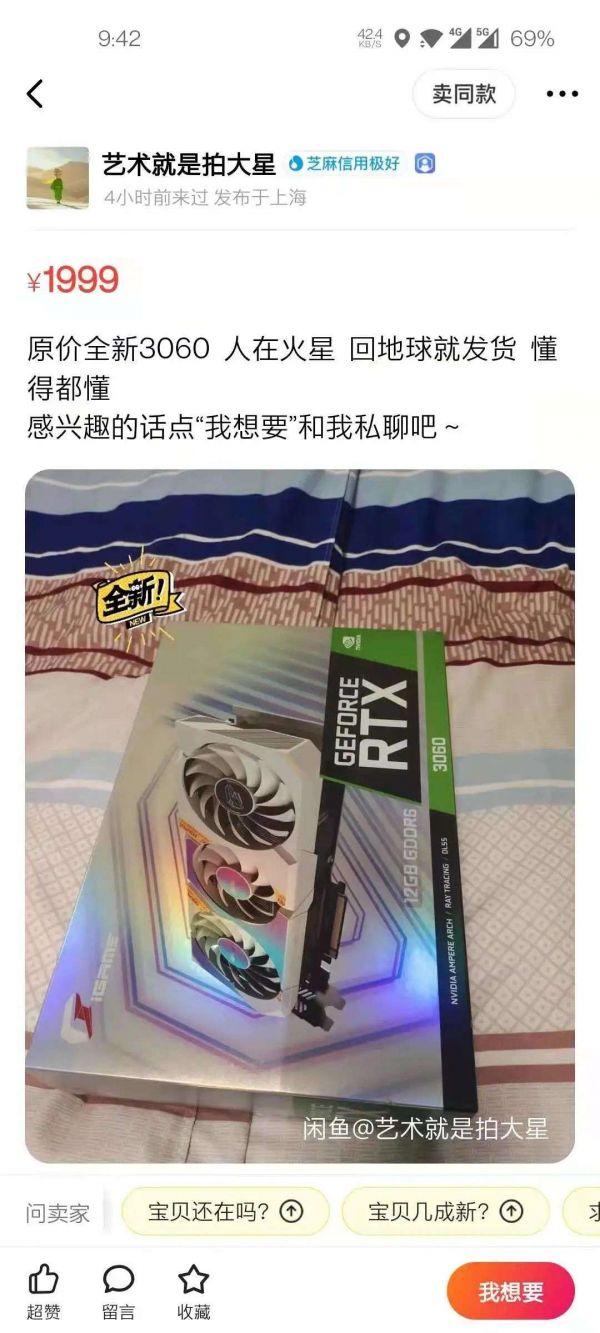 显卡吧的网友携带着其他网友和网上搜罗的截图,前往闲鱼发布大量原价显卡出售帖。比如RTX 3060,目前的淘宝售价均在4000以上,少量未锁算力版本更是超过5000,而显卡吧网友则以RTX 3060的官方建议售价2499“出售”。