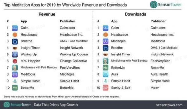 2019 年全球冥想 App 收入和下载量前十。数据来源:SensorTower
