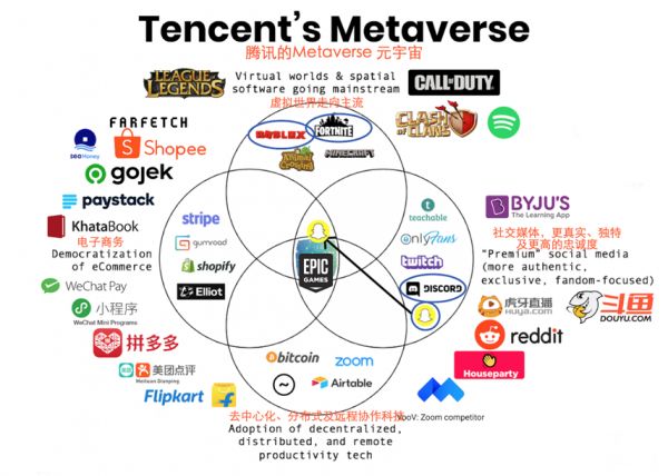 正如很多人认为国内最有可能实现的Metaverse的或许是腾讯。这并不是说腾讯个体能力有多强,更在于腾讯兼容的能力。