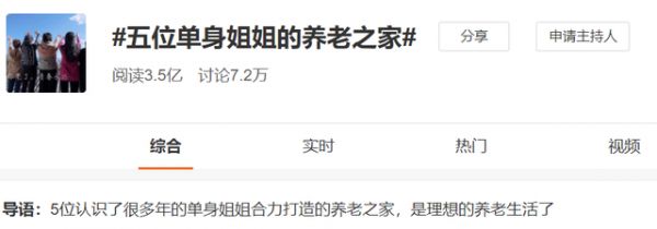 前不久,5个单身姐姐在全中国寻找居住地,最终决定合伙在丽江置房共居、抱团养老的新闻,直接被年轻网友们送上了热搜,阅读量高达3.5亿,不少人直呼“这就是理想的养老生活了”。