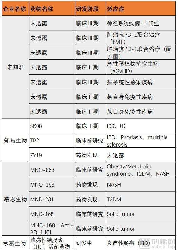 在药物研发方面,除了上述新企业布局外,还有奕景生物、未知君、承葛生物、知易生物、慕恩生物等共7家企业。其中,部分企业其药物研发进展如下。