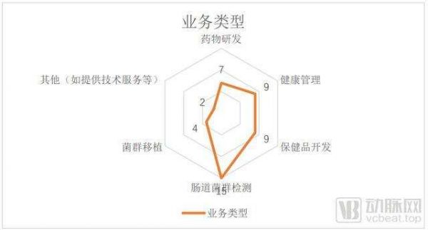 由上表可知这些企业主要是基因检测公司、生物医药公司和结合基因检测技术和治疗方案开发的生物科技公司三类。那么依据这22家企业提供的产品和服务的不同,对其业务进行进一步分类,可以划分为药物研发、健康管理、食品开发、肠道菌群检测、菌群移植和其他(提供科研技术服务等)6类,分布如下图。