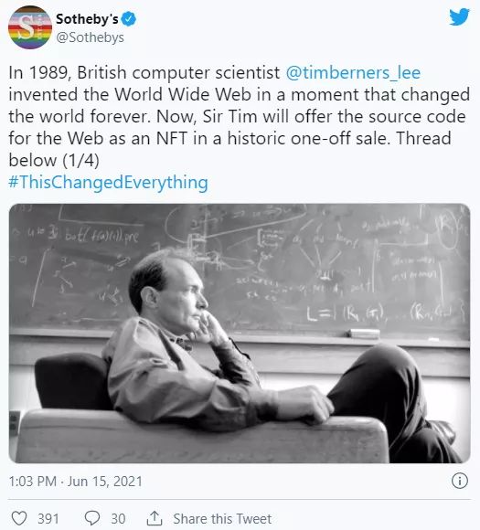 近日,著名的苏富比拍卖行通过推特宣布,被誉为“万维网发明者”的英国计算机科学家、蒂姆·伯纳斯-李(Tim Berners-Lee)爵士将在以太坊区块链上创建具有30年历史的万维网(WWW,World Wide Web)源代码的 NFT。