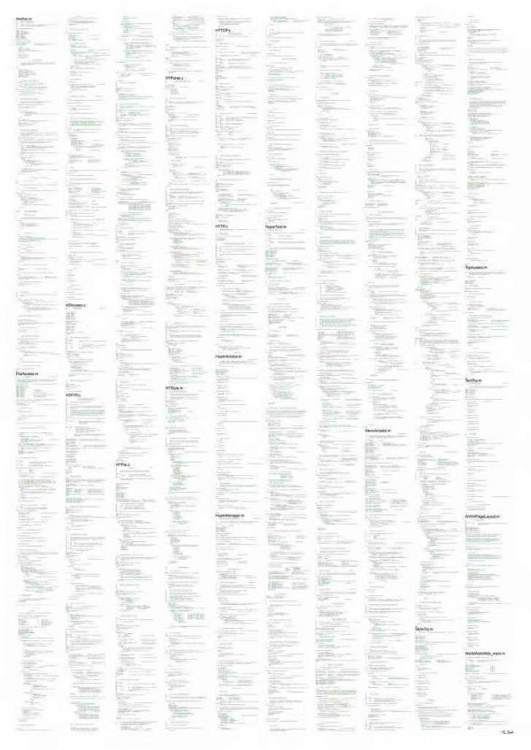 这件NFT拍品由四个部分组成——用 Objective-C 编程语言编写的9500 多行代码,涵盖了支持Internet的语言和协议的基础:超文本传输协议 (HTTP)、超文本标记语言 (HTML) 和通用文档标识 (URl)。NFT 中还包含了完整代码的“数字海报”,这个海报使用Python脚本进行可视化,并附有伯纳斯-李的数字签名。这些都是为构建万维网的关键元素。