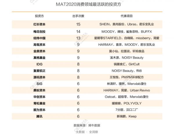 《2020消费领域投融资趋势报告》显示,2020年,梅花创投以14次投资居消费领域活跃投资方排名第二,以1次之差仅次于红杉资本,他们投资的项目包括新锐美瞳品牌Moody、国货彩妆品牌牌技等。