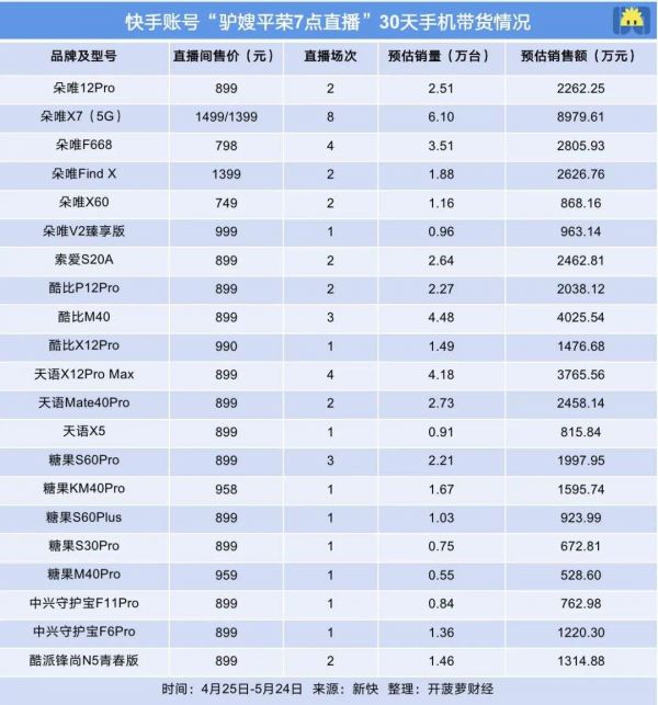 开菠萝财经根据新快数据不完全统计,二驴夫妇在近30天内(4月25日-5月24日期间)通过“驴嫂平荣7点直播(以下简称驴嫂平荣)”直播间售卖了7个手机品牌的21款机型,涉及到的品牌除了朵唯,还有索爱、酷比、天语、糖果、守护宝等,累计销量近45万台,销售额接近4.5亿元。