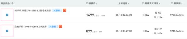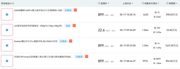 开菠萝财经根据新快数据统计,“驴嫂平荣”直播间在4月25日-5月24日期间30天的29场直播中,售卖了7个品牌的21款机型,涉及到的品牌除了朵唯,还有索爱、酷比、天语、糖果、守护宝等,单机售价在769元到1499元不等,累计销量近45万台,月销售额接近4.5亿元。