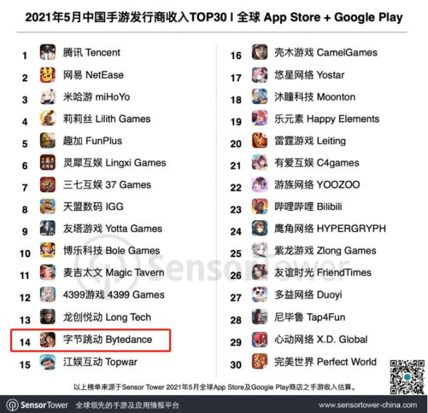 5月份的时候,字节跳动已经排在全球手游发行商的第14名,收购的沐瞳科技和有爱互娱也同样位列榜单其中。若合并来看,字节跳动在海外游戏市场的影响力还会更大。