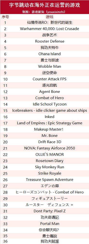 目前,字节跳动在海外运营的游戏共有36款游戏: