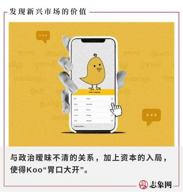 Koo对印度民族主义政客的示好,并从中获得支持,帮助它在印度积累约600万用户,而Twitter的用户数约为1700万。今年5月,Koo融资3000万美元,投资者不乏老虎全球这样的知名基金。
