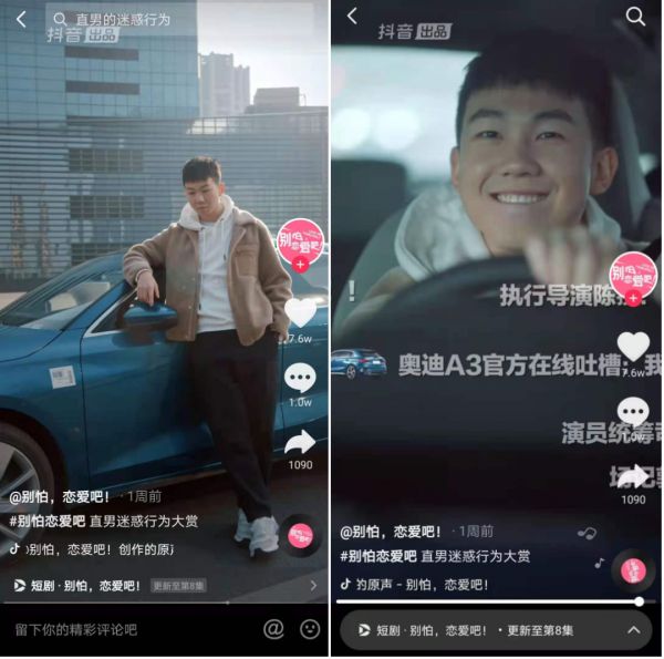 目前典型的案例已有不少。年初腾讯微视与星之传媒合作上线了一部主播养成类微短剧《上头姐妹》,创新地将剧中的直播情节变为真正的实时直播带货,被带货的多个品牌由此自然地融入到了内容中。近期,抖音上线由华谊兄弟和抖音共同出品的竖屏短剧《别怕,恋爱吧》,奥迪就在剧中进行了植入。由于是完全融入了剧情并且在台词上也没有提及,品牌产品植入的相当自然。最后奥迪这一品牌名还以吐槽弹幕的形式出现,进一步强化了曝光。