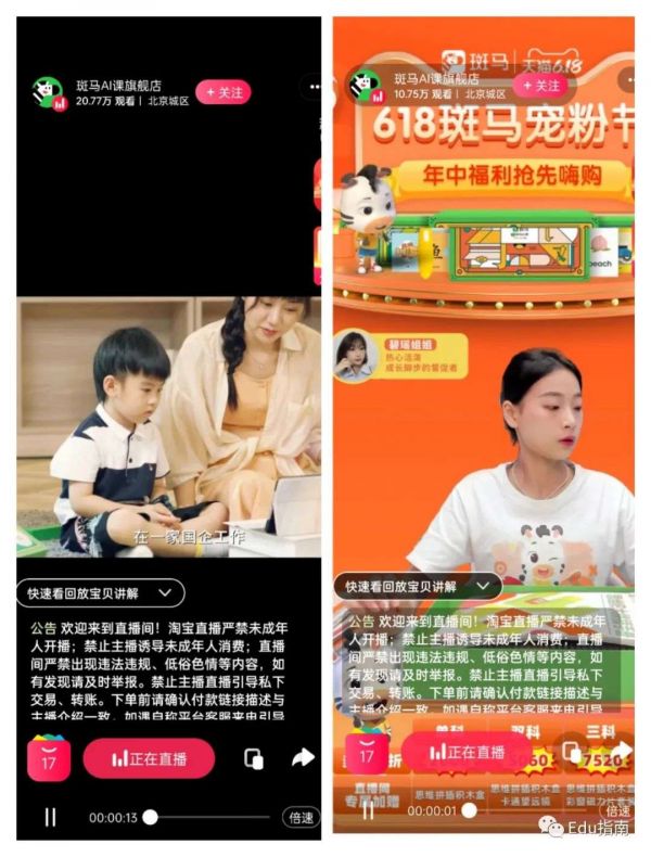 学前头部品牌斑马AI,在618期间,淘宝直播间多次超过10万人次收看。据Edu指南统计,该公司在淘宝的正价课程,已有数千付费人次(备:千元及以上课程),贡献销售额超过1819万元。