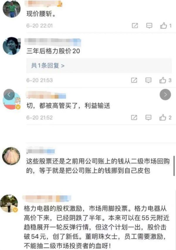 格力电器从二级市场股东手中回购股票,再以接近半价的折扣价卖给激励对象,实质是将回购激励利差转移给董监高、中层和核心员工。格力电器中小投资者因此斥责格力电器损公肥私。知名财经评论人士皮海洲更是指出格力电器涉嫌利益输送。