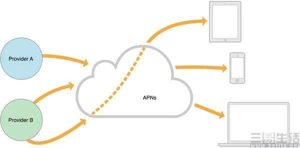 而反观iOS,尽管其所采用的是“墓碑机制”的假后台,但在iOS 3.0时苹果就推出了APNS(Apple Push Notification Service),通过统一交由苹果负责的推送服务,在应用并未运行的情况下,APP的服务器向苹果服务器发送通知,再由苹果服务器发送给用户。因此所带来的结果就是iPhone的耗电量降低,同时还减轻了内存的负担。