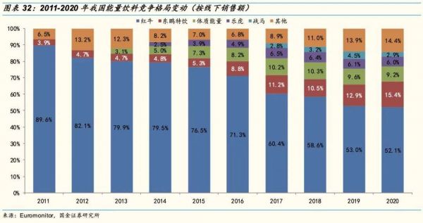 据国金证券研报数据。在2016年之后,红牛市占率呈现快速下滑的趋势,到了2020年已降至 52.1%。