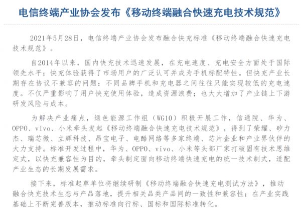 前段时间,工信部主管的「电信终端产业协会」发布了《移动终端融合快速充电技术规范》,该《规范》直指当前手机等产品在快充协议上存在的不兼容问题,并提出了相关解决措施。值得注意的是,华为、小米、OV 国产四大头部厂商也是这一《规范》的共同发起者,而且还得到了荣耀、瑞芯微、立辉科技等多家终端厂商和芯片厂商的支持。
