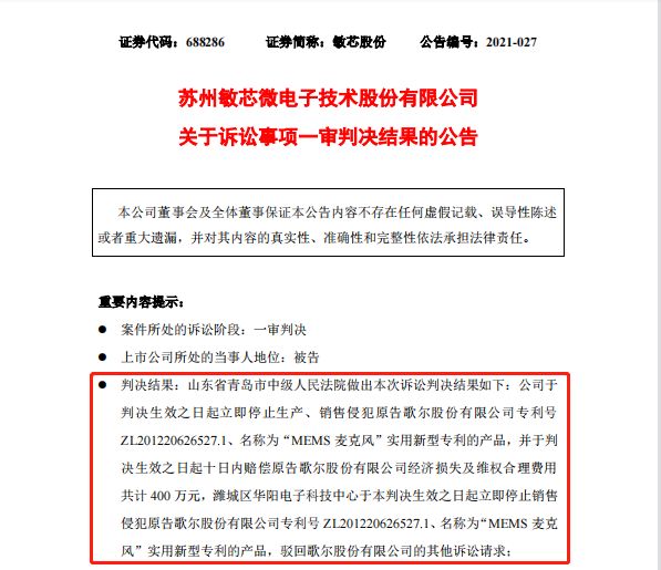 这份判决书,让千亿白马、行业龙头歌尔股份的专利维权之路得到正名,同时坐实了公司体量较小的行业竞对敏芯股份的侵权行为,并判定后者赔偿歌尔股份400万元经济损失及维权合理费用,并立即停止对涉侵权专利相关产品的生产销售。
